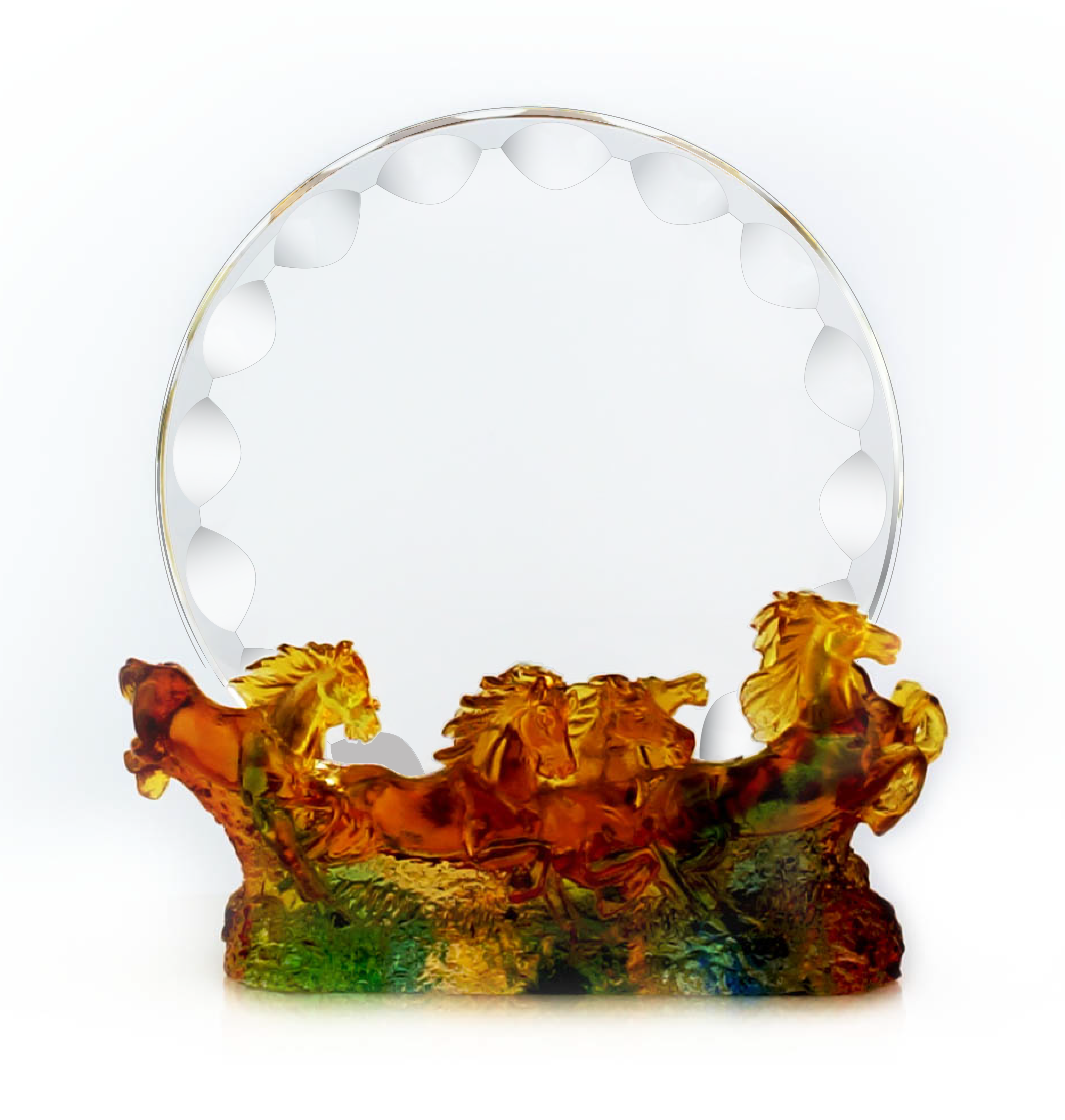 Introducing the exquisite 8 Series Supreme Liu-Li Horse Field Plaque, a stunning piece of art that combines traditional Chinese craftsmanship with modern elegance. The Horse Field design symbolizes power, strength and grace in the field of competition.